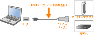 RS-232Cを搭載したモデムやターミナルアダプタ(TA)から各種計測器等のシリアル接続機器を、RS-232Cポートを装備していない省スペースパソコンやノートパソコンのUSBポートに接続できます。