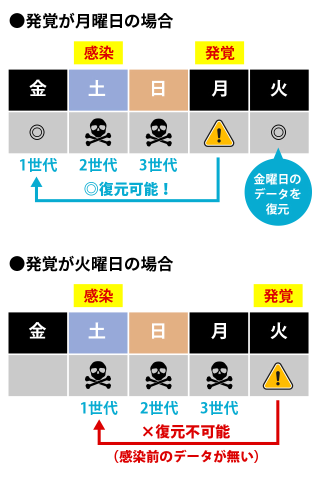 週末に感染しても月曜日に発覚すれば前週金曜日のデータを復元できます。しかし、発覚が1日でも遅れた場合や、GWや年末年始などの長期休暇中に感染した場合、復元は不可能です。