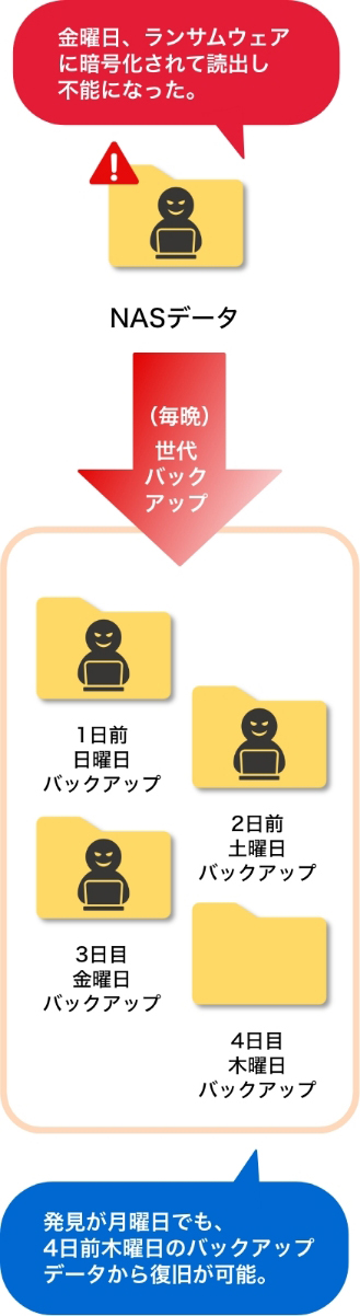 ランサムウェアは、感染したパソコンから読み書きできるドライブ(内蔵HDD、パソコンに接続した外付けHDD、共有されたNASなど)のファイルの暗号化処理を試みます。しかし、バックアップ先のドライブを読み書きできないようにしておくことで、バックアップデータをランサムウェアによる被害から守ることが可能です。そのためファイル共有用途のNASやファイルサーバーのデータを、パソコンから読み書きできないドライブにバックアップしていただくことで、ランサムウェアの被害を最小限に抑えることが重要です。