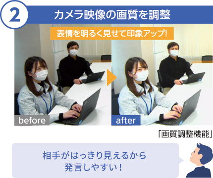 カメラ映像の明るさやコントラストなどの「画質調整機能」と、映像の一部分を拡大表示したり、2台のカメラ映像を合成したりする「ミックスカメラ機能」の2つの機能を使うことができます。