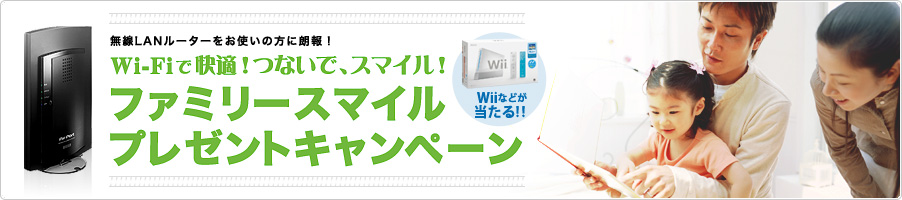 本キャンペーンは終了しました。たくさんのご応募、誠にありがとうございました。| 当社無線LANルーターをお使いの方に朗報!!ルーターに搭載されたフィルタリング機能を使っていただいた方の中から抽選で30名様に「Wii」などをプレゼント! ぜひ、ふるってご応募ください。 |
