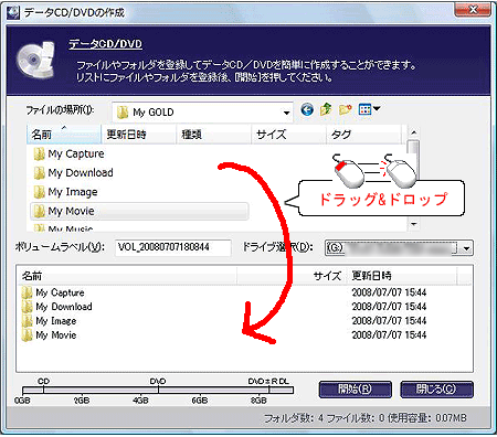 ここではDVDメディアを例にしておりますが、BD-R/REメディアやCD-R/RWメディアでも同様な手順でデータを書き込むことができます。