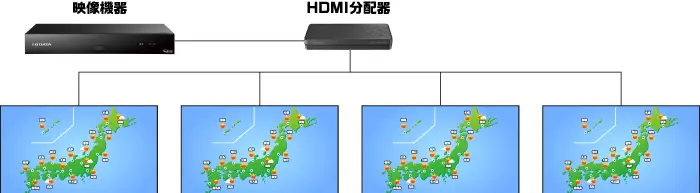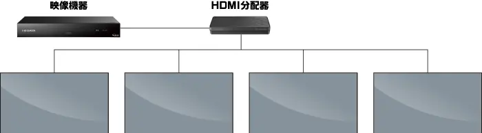 映像機器と HDMI 分配器をつなぎ、HDMI 分配器に 4 台の本製品をつなぐ