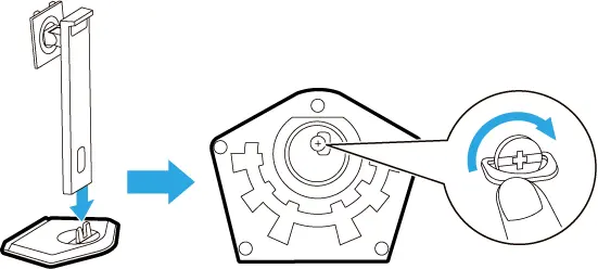 - 台座を持ち上げ、台座の底面側にあるネジの金具を起こし、時計回りに回して固定する