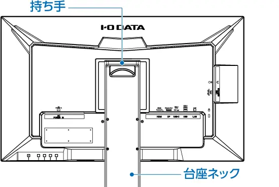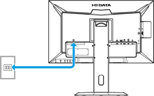 画面割れを防ぐために持ち手や台座ネックを持ち、本製品を机の上などに設置してください。電源コードを「AC POWER IN」に挿し、電源コンセントとつなぐ