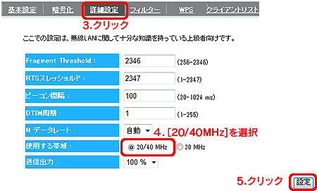 本製品は初期設定で20MHz 65Mbpsでの動作となります。 本製品で150Mbps(規格値)の通信速度を利用するためには、以下の手順にしたがって、設定をしてください。