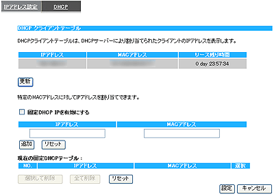 [現在の固定DHCPテーブル]に追加したIPアドレス、MACアドレスを表示されます。 |