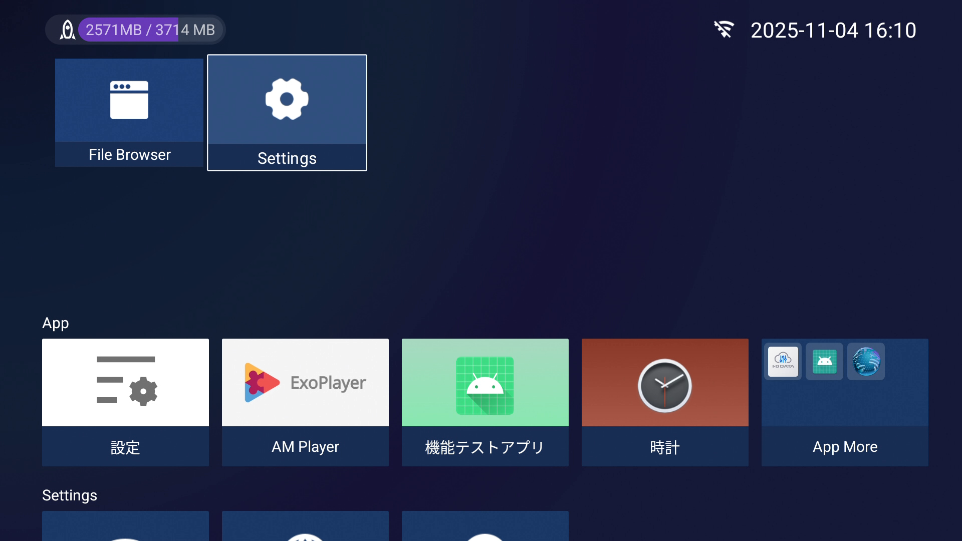 ホーム画面 名称機能 現在のメモリー消費量を表示します。File Browserアイコン本体内や外部接続のmicroSDカード、USBメモリーの内容が確認できます。Settingsアイコン本製品の基本設定ができます。Appメニュー本製品にインストールされているアプリが表示されます。[App More]を開くとすべてのアプリが表示されます。Settingsメニューよく使われる設定(ネットワーク、言語、時刻)をピックアップして表示します。