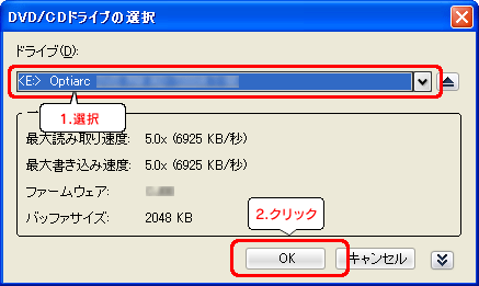 4[ドライブ]で本製品を選択し、[OK]ボタンをクリックします。