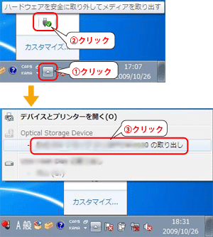 Windows 7では、下記操作を行なうと、「本製品の取り外し」ではなく、「メディアの取り出し」操作が行なわれます。