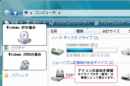例えばWindows XPでDVD-Rのブランクメディアを挿入した場合、[CDドライブ]となります。