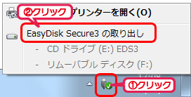 画面右下のタスクトレイにある[ハードウェアの安全な取り外し]アイコンをクリックし、[Easy Disk Secure3 の取り出し]をクリックします。