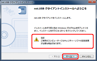 net.USBクライアントインストールウィザードが起動します。注記を確認し、「次へ」をクリックします。