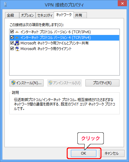 ①[リモート ネットワークでデフォルト ゲートウェイを使う]にチェックします。 ②[OK]をクリックします。