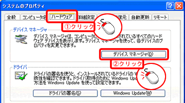 [ハードウェア]タブをクリックして、[デバイスマネージャ]ボタンをクリックします。