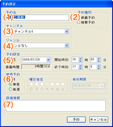 | (1) | 予約名 | 番組の名前を入力します。 テレビの番組表から予約した場合は、自動的に番組の名前が入力されます。 |