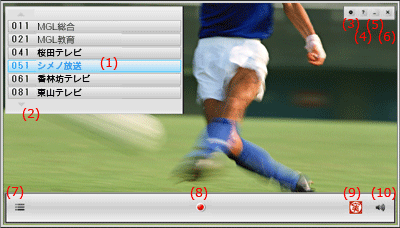 | (1) | チャンネルリスト | 現在選択できるチャンネルを表示します。 チャンネル名が取得できない場合には、3桁で表示されます。 |