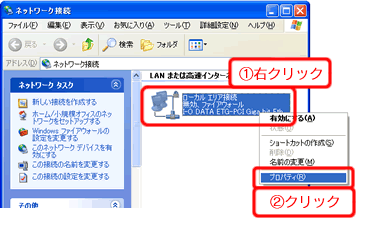 [ローカルエリア接続]を右クリックし、メニュー内の[プロパティ]をクリックします。 |