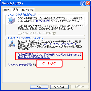 [共有]タブで、[危険を認識した上で、ウィザードを使わないで・・・・]をクリックします。 |
