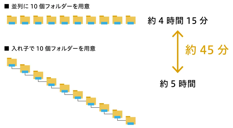 ※ ファイル数やフォルダー構造(入れ子など)、ネットワーク環境などによってかかる時間は変動します。