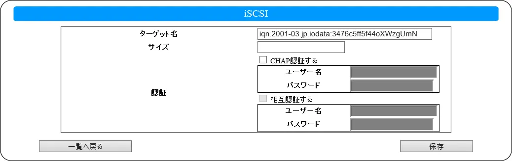 ターゲット名 任意の名前を入力します。 サイズ 使用するディスクサイズを設定します。