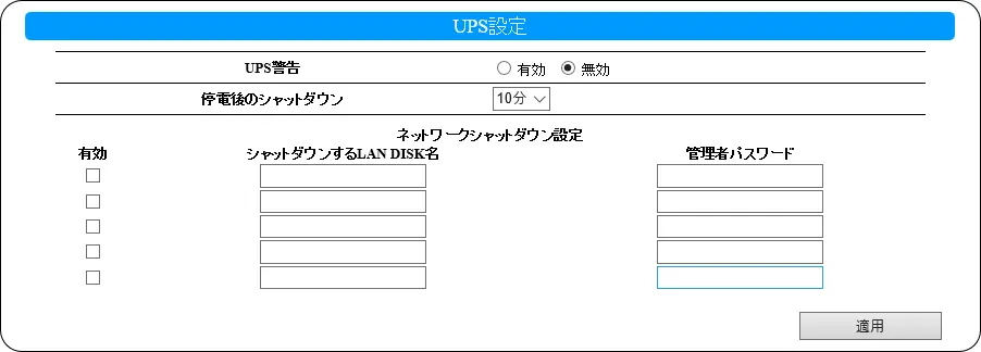 ひとつの UPS に複数の LAN DISK シリーズの電源をつないでいる環境において、ネットワークシャットダウン機能を設定すると、UPS とつないでいない LAN DISK シリーズも停電時にシャットダウンすることができます。(最大 5 台)
