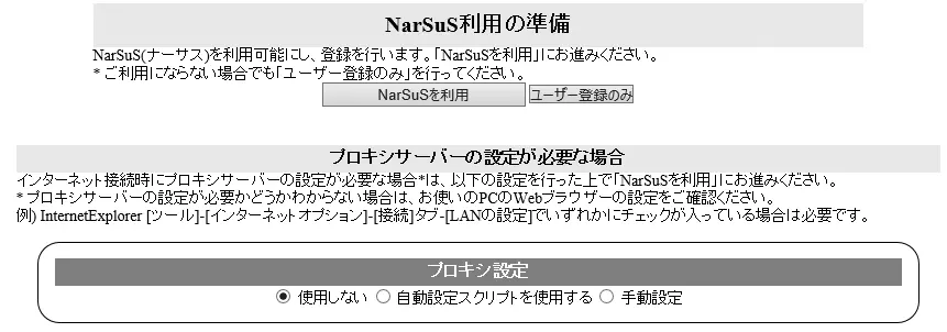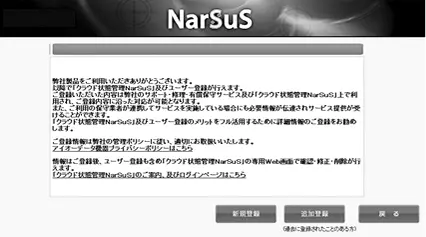 本製品の NarSuS登録画面で[ユーザー登録のみ]をクリックする※[ユーザー登録のみ]がなく[登録]がある場合は、それをクリックします。