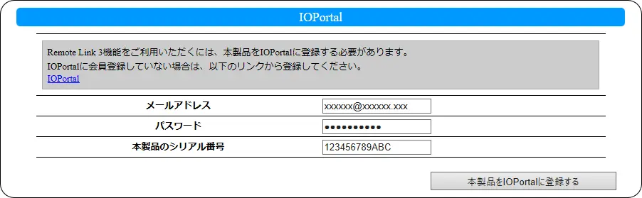 IOPortalRemote Link 3 機能を使うために、入力した内容を IOPortal に登録します。 ● メールアドレスIOPortal に登録したメールアドレスを入力します。● パスワードIOPortal に登録したパスワードを入力します。● 本製品のシリアル番号本製品のシリアル番号を入力します。