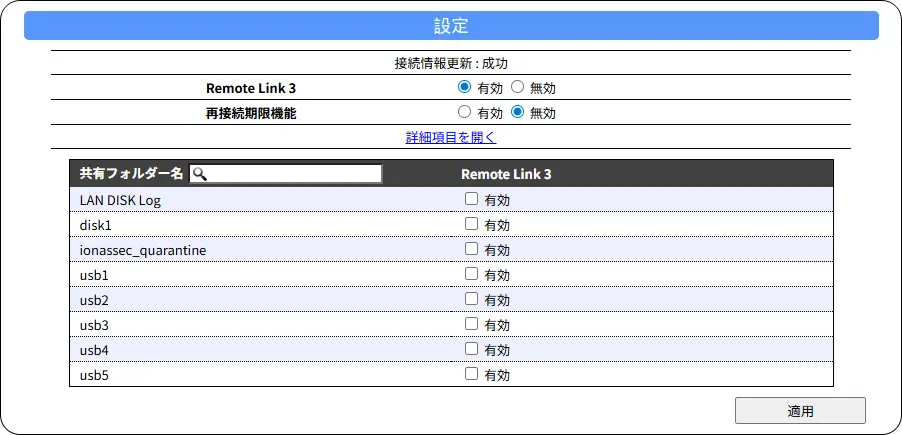 ※ 下の共有フォルダー一覧で「Remote Link 3」にチェックを付けた共有フォルダーだけが Remote Link 3機能で接続できます。