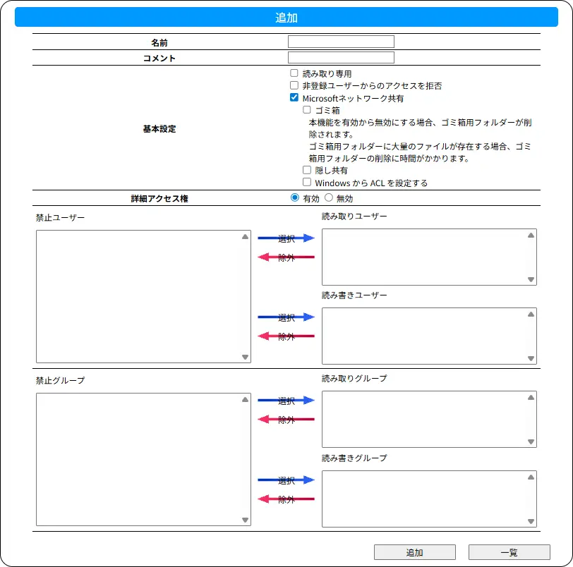該当するアクセス権のユーザーやグループを選んで[除外]をクリックすると、そのユーザーやグループが禁止ユーザー、禁止グループに追加されます。 - 無効
