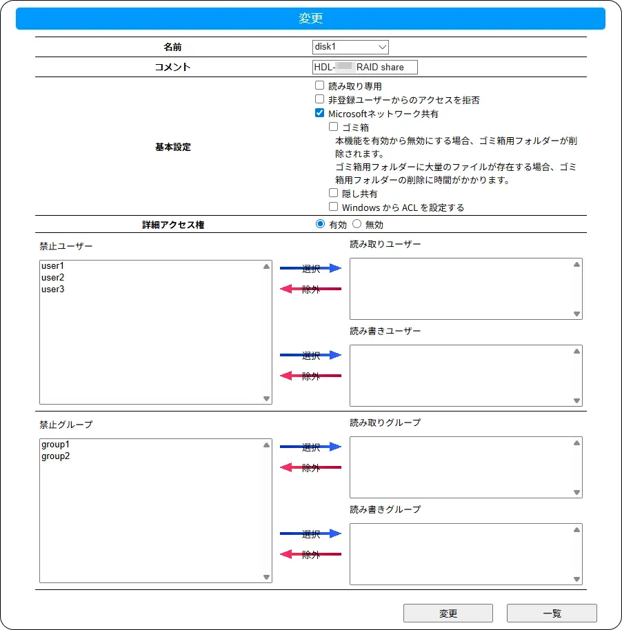 該当するアクセス権のユーザーやグループを選んで[除外]をクリックすると、そのユーザーやグループが禁止ユーザー、禁止グループに追加されます。 - 無効
