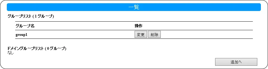 一覧(グループ) ● グループリストグループ名を表示します。また操作でグループを操作します。変更グループの設定を変更します。削除グループを削除します。● ドメイングループリストドメイングループを表示します。● 追加へグループの追加画面を表示します。▶ 追加(グループ)