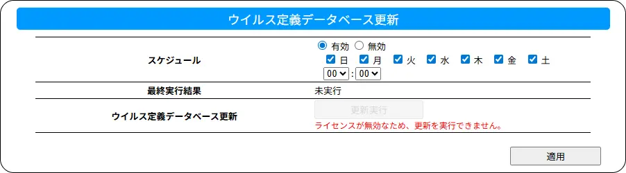 ウイルス定義データベース更新 ● スケジュール設定したスケジュールでウイルス定義データベースを更新します。出荷時設定 有効、全ての曜日、00:00● 最終実行結果最後に実行したウイルス定義データベース更新の結果を表示します。● ウイルス定義データベース更新ウイルス定義データベースを更新します。