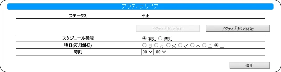 - アクティブリペアのスケジュール実行時刻に本製品の電源が OFF の場合、アクティブリペアのスケジュール実行は行われませんので、スケジュール実行時刻には本製品を起動しておいてください。