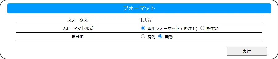 フォーマット(USBx) ● ステータスフォーマットの状況を表示します。● フォーマット形式フォーマット形式を選びます。出荷時設定 専用フォーマット● 暗号化暗号化の有効/無効を選びます。出荷時設定 無効設定例▶ ボリュームを暗号化する