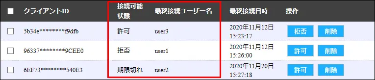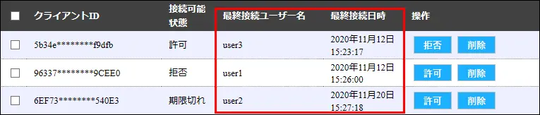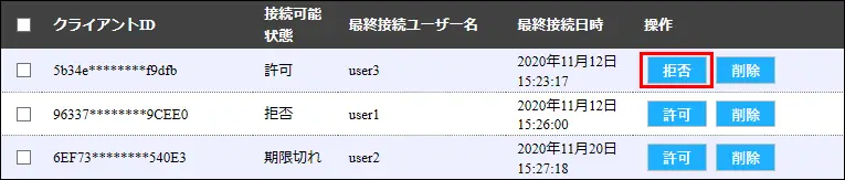 最終接続ユーザー名や最終接続日時などを参考に探してください。対象のクライアントの[拒否]をクリックする