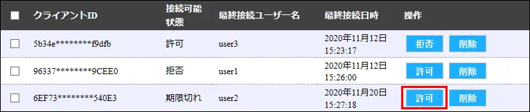 接続可能状態や最終接続ユーザー名などを参考に探してください。対象のクライアントの[許可]をクリックする