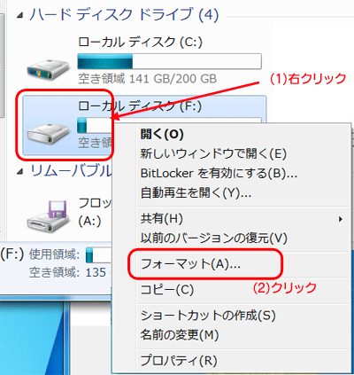 本製品のアイコンを右クリックし、表示されたメニューから[フォーマット]をクリックします。
