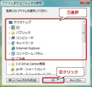 登録したいファイル/フォルダまたはプログラムを選択し、[OK]ボタンをクリックします。