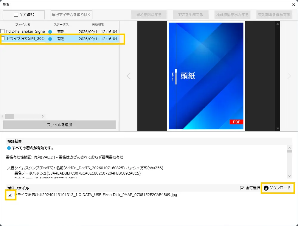 PDF ファイルでないファイルを署名した場合など、署名した電子文書に添付ファイルがある場合に、添付ファイルを取り出します。
