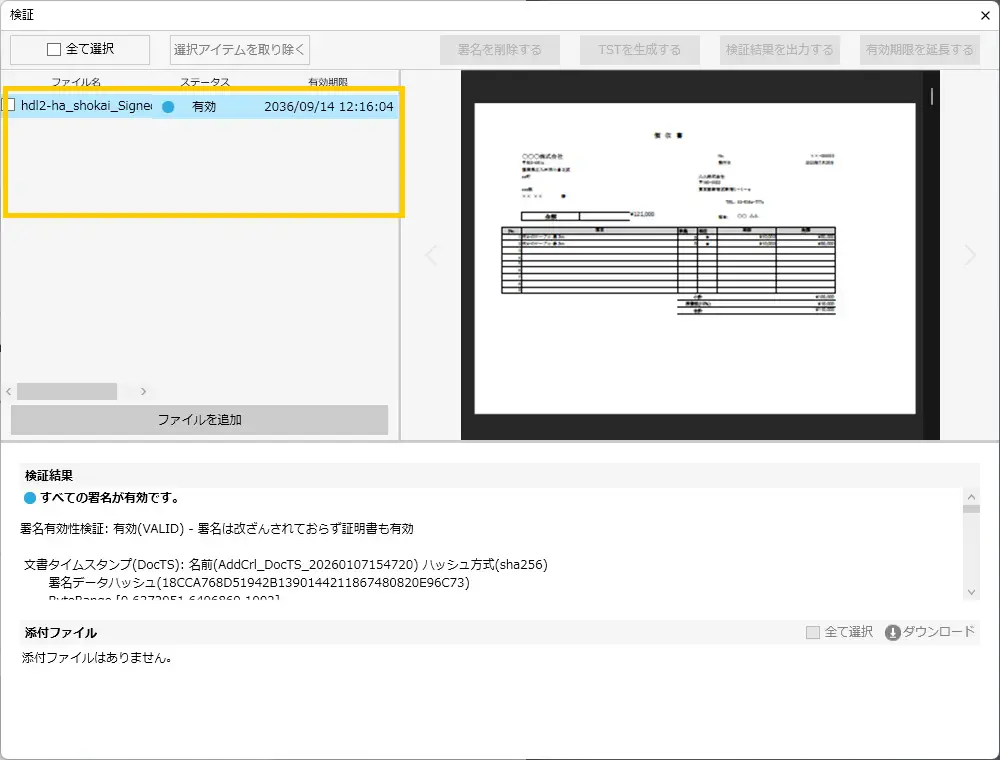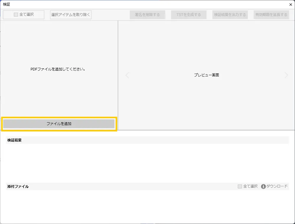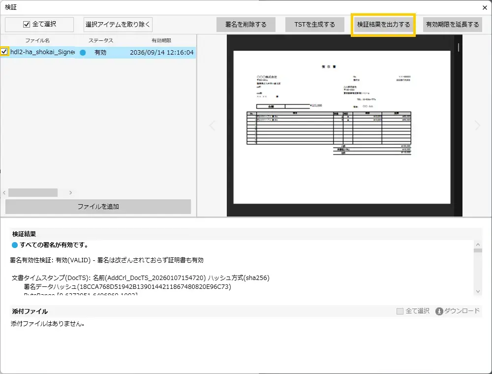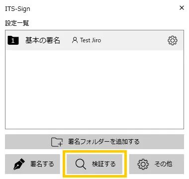 検証する署名済み電子文書が有効な状態かどうかを検証します。本アプリを開く[検証する]をクリックする [ファイルを追加]をクリックする ファイルの追加方法を選ぶファイルを選択して追加するファイル単位で追加できます。選択したフォルダー内のファイルを追加する選んだフォルダー内のファイルを一括で追加します。[サブフォルダー内のファイルを追加する]にチェックを付けると、サブフォルダー内のファイルも追加の対象になります。 検証するファイルを選ぶ⇒ 検証結果を表示します。 lightbulb参考検証結果をファイルとして出力する検証結果は xml 形式または txt 形式で出力できます。検証結果を出力するファイルにチェックを付ける[検証結果を出力する]をクリックする