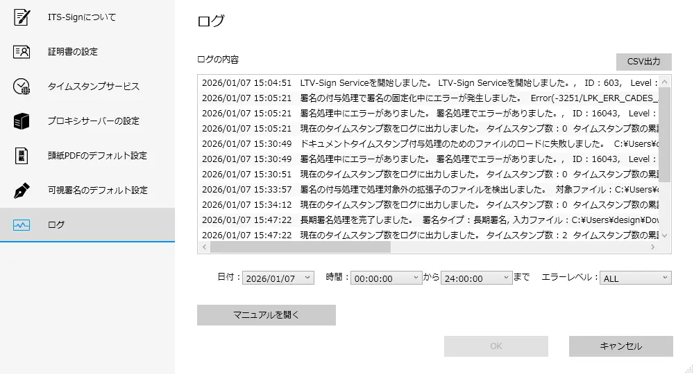 日付、時間、エラーレベルでログを絞り込むことができます。 - マニュアルを開く