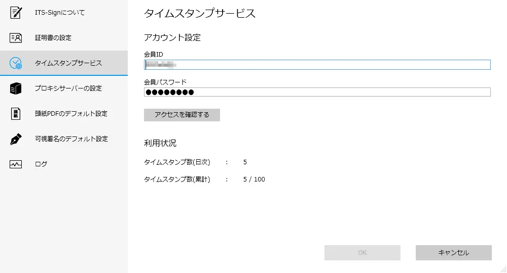 タイムスタンプサービスアイオートラストサービスで発行したライセンスの ID、パスワードを設定できます。 会員 IDアイオートラストサービスで発行したライセンスの ID を入力します。会員パスワードアイオートラストサービスで発行したライセンスの パスワードを入力します。アクセスを確認するタイムスタンプサーバーへ接続できることを確認します。利用状況タイムスタンプサービスの利用状況を表示します。