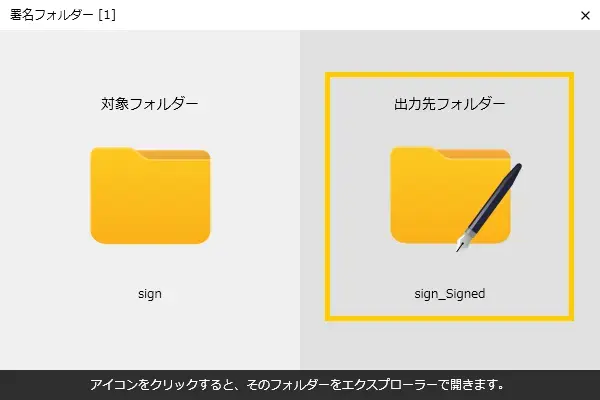 署名フォルダーで設定した ”署名対象フォルダー” に電子文書を保存すると、署名済みファイルが ”出力先” に保存されます。