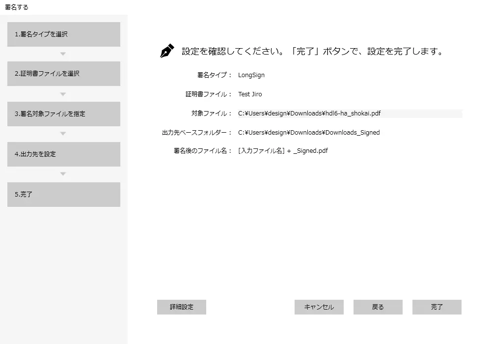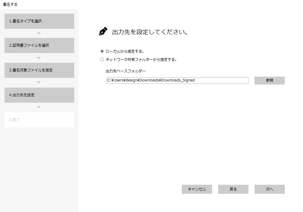 このフォルダーに署名したファイルを出力します。lightbulb参考2 か所のフォルダーに署名ファイルを出力したい場合次の画面の詳細設定で 2 か所目の ”出力先” を指定できます。