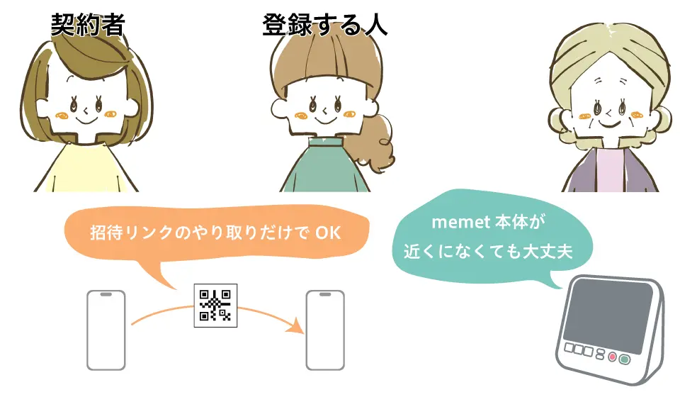 遠隔で memet アプリに本体を登録するmemet アプリに memet 本体を登録し、通話できるようにします。memet 本体が側にない状況で、契約者から招待してもらったリンクから登録をします。1. 契約者:招待リンクを送る2. 登録する人:招待リンクから memet アプリに本体を登録する
