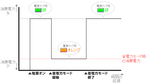 一定時間パソコンを操作しなかった場合やパソコンの電源を切った場合に、自動的にディスプレイの消費電力を抑える機能のことです。省電力モード時は画面は真暗になります。