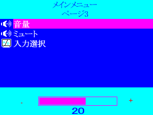 [MENU]ボタンを押して、[ページ3]を表示させます。 ⇒[音量]が選択されています。