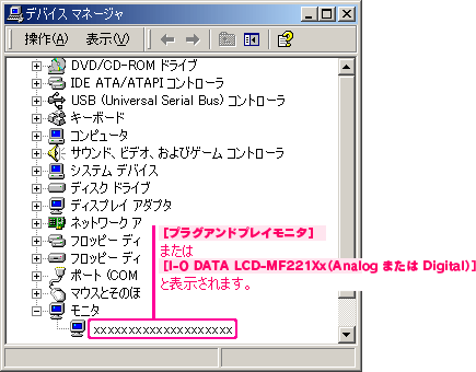 DATA LCD-MF221Xx(Analog)]または[I-O DATA LCD-MF221Xx(Digital)]と表示されていれば、正しく認識されています。 |