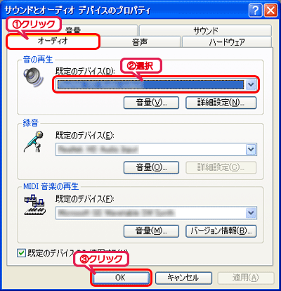 設定したい再生デバイスを選択し、[規定値に設定]をクリックし、[OK]をクリックします。 |